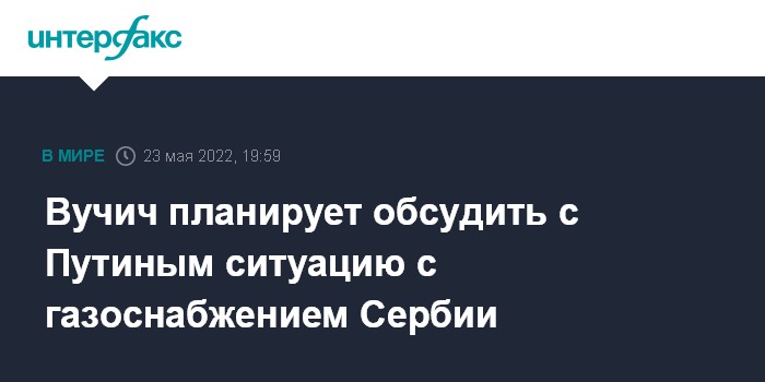 Москва. 23 мая. INTERFAX.RU - Президент Сербии Александр Вучич намерен в ближайшие дни обсудить с российским лидером Владимиром Путиным ситуацию с газоснабжением республики.