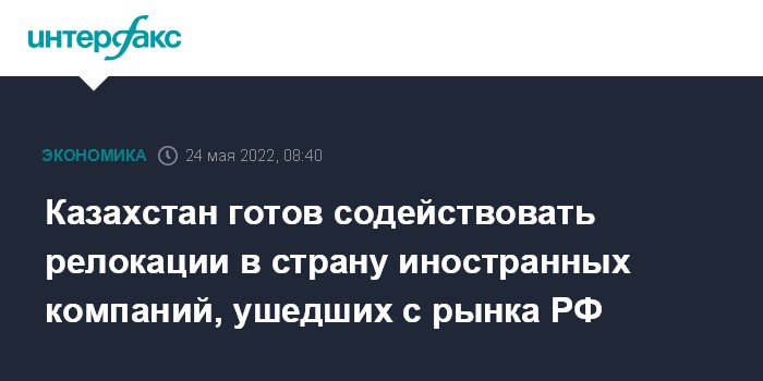Москва. 24 мая. INTERFAX.RU - Казахстан готов создать условия для релокации иностранных компаний или создания совместных предприятий на фоне их ухода с российского рынка, сообщил председатель правления национальной компании Kazakh Invest, курирующей привлечение иностранных инвестиций в страну, Меиржан Юсупов.