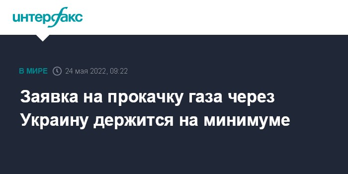 Москва. 24 мая. INTERFAX.RU - "Оператор ГТС Украины" принял от "Газпрома" заявку на транзит газа на вторник в объеме 46,1 млн кубометров, свидетельствуют данные ОГТСУ. Показатель в понедельник был 44,3 млн кубометров. Мощности заявлены только по одной из двух точек входа в ГТС Украины - газоизмерительной станции "Суджа", по коридору через ГИС "Сохрановка" заявка не принята.