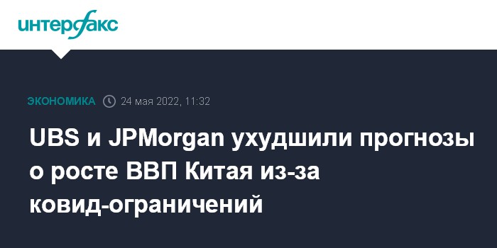 Москва. 24 мая. INTERFAX.RU - Аналитики UBS Group AG и JPMorgan Chase понизили прогнозы по росту ВВП Китая на 2022 год в связи с жесткими карантинными мерами, введенными из-за коронавируса.