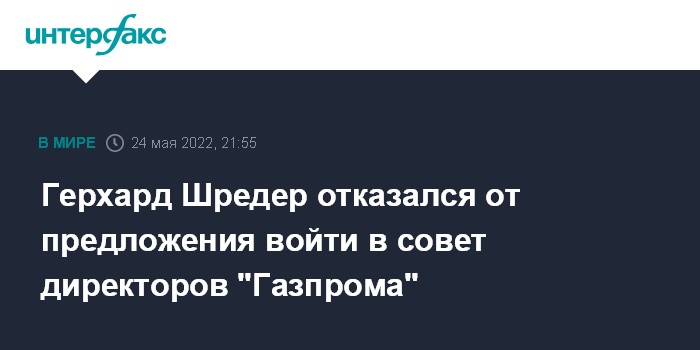 Москва. 24 мая. INTERFAX.RU - Экс-канцлер ФРГ Герхард Шредер отклонил предложение войти в совет директоров компании "Газпром".