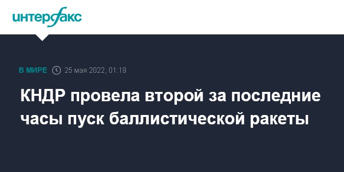 Москва. 25 мая. INTERFAX.RU - Северная Корея провела за последние часы уже два пуска баллистических ракет, сообщают в среду южнокорейские СМИ со ссылкой на командование ВС Южной Кореи.