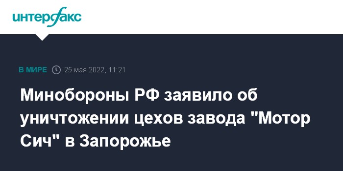 Москва. 25 мая. INTERFAX.RU - Ударом высокоточных морских и авиаракет по Запорожью уничтожены цеха завода "Мотор Сич", выпускавшего двигатели для самолетов и беспилотников, заявил официальный представитель Минобороны РФ Игорь Конашенков.