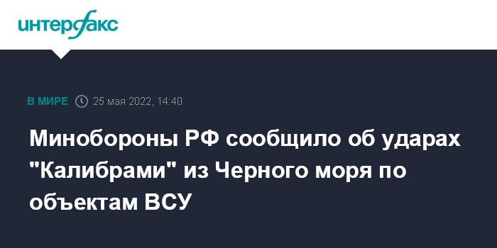 Москва. 25 мая. INTERFAX.RU - Высокоточный ракетный удар по военным объектам на Украине был нанесен залпом ракет "Калибр" с фрегата из акватории Черного моря, сообщили в Минобороны РФ.