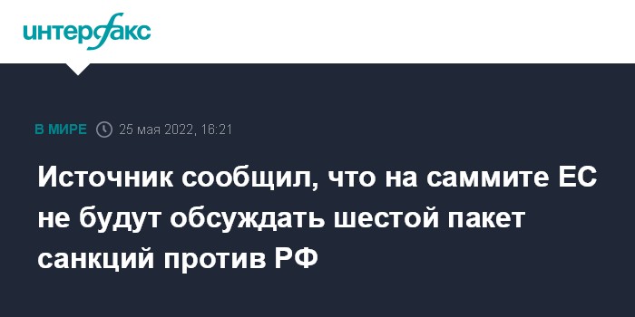 Москва. 25 мая. INTERFAX.RU - Обсуждение шестого пакета санкций в отношении России на саммите ЕС 30-31 мая не предусмотрено из-за сохраняющихся разногласий между странами Евросоюза, сообщил источник в ведомстве федерального канцлера ФРГ.