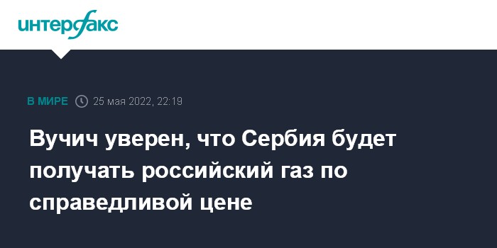 Москва. 25 мая. INTERFAX.RU - Президент Сербии Александр Вучич выразил уверенность, что страна будет покупать у России газ по справедливой цене и в необходимых количествах.