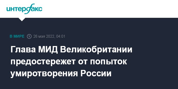 Москва. 26 мая. INTERFAX.RU - Министр иностранных дел Великобритании Лиз Трасс в ходе визита в Боснию и Герцеговину призовет западных партнеров Соединенного королевства обеспечить победу Украины и предостережет от попыток умиротворения России.