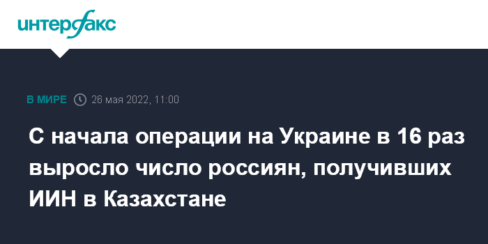 Москва. 26 мая. INTERFAX.RU - С начала военной спецоперации России на Украине индивидуальный идентификационный номер (ИИН) в Казахстане получили 35 782 граждан России, сообщили агентству "Интерфакс" в МВД Казахстана.