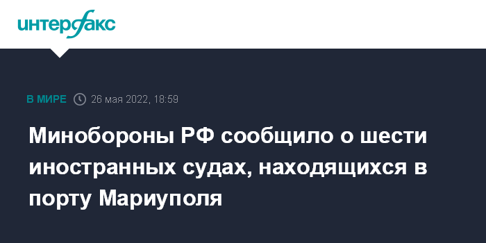 Москва. 26 мая. INTERFAX.RU - Шесть иностранных судов не покидают Мариуполь, хотя российские военные устранили минную опасность в акватории порта, сообщил начальник Национального центра управления обороной Российской Федерации генерал-полковник Михаил Мизинцев.