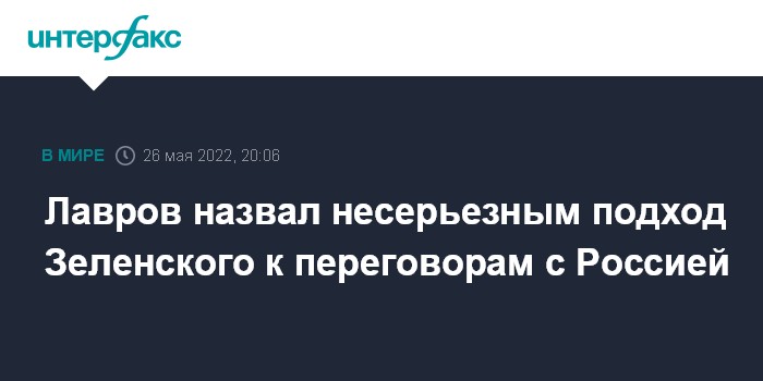 Москва. 26 мая. INTERFAX.RU - Глава МИД РФ Сергей Лавров назвал несерьёзными недавние заявления президента Украины Владимира Зеленского относительно его видения переговоров между Москвой и Киевом.
