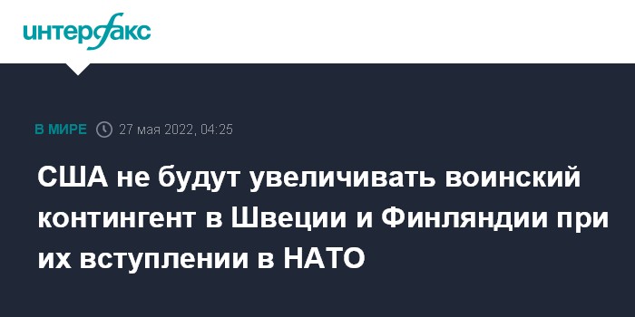 Москва. 27 мая. INTERFAX.RU - Если Финляндия и Швеция станут членами НАТО, Соединенные Штаты не будут увеличивать численность своих сухопутных войск в этих странах, заявил американский генерал Кристофер Каволи в сенате США.