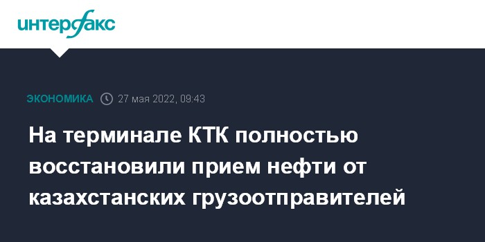 Москва. 27 мая. INTERFAX.RU - Прием нефти от казахстанских грузоотправителей восстановлен в полном объеме на всех причалах "Каспийского трубопроводного консорциума" (КТК), ограничения сняты, сообщила пресс-служба правительства Казахстана в пятницу.