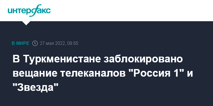 Москва. 27 мая. INTERFAX.RU - В Туркменистане заблокировано вещание российских телеканалов "Россия 1" и "Звезда", которые транслировал крупнейший лицензированный оператор связи страны АОЗТ "Ашхабадская городская телефонная сеть".