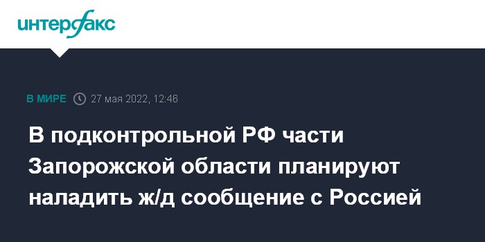Москва. 27 мая. INTERFAX.RU - Железнодорожное предприятие сформировано на подконтрольной РФ части Запорожской области, прорабатываются логистические цепочки через Донбасс, сообщил "Интерфаксу" заместитель главы военно-гражданской администрации (ВГА) региона Андрей Трофимов.