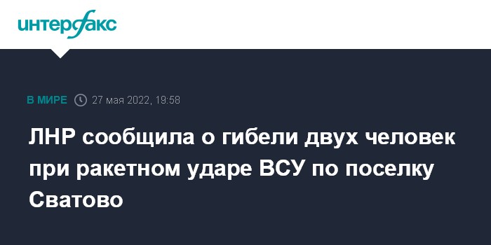 Москва. 27 мая. INTERFAX.RU - Двое мирных жителей погибли в результате ракетного удара Вооруженных сил Украины по подконтрольному Луганской народной республике поселку Сватово, сообщили в Генеральной прокуратуре ЛНР.