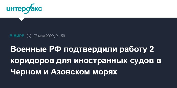 Москва. 27 мая. INTERFAX.RU - Два гумкоридора в Черном и Азовском морях для иностранных судов продолжают работу, сообщили в Минобороны РФ.