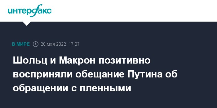 Москва. 28 мая. INTERFAX.RU - Канцлер ФРГ Олаф Шольц и президент Франции Эммануэль Макрон позитивно отнеслись к обещанию президента РФ Владимира Путина обращаться с пленными согласно нормам международного права, сообщил официальный представитель правительства Германии Штеффен Хебештрайт.