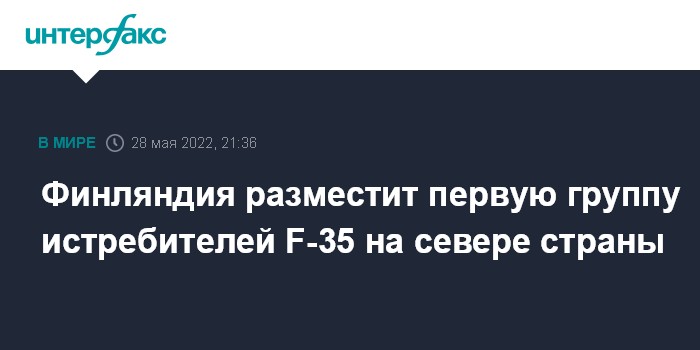 Москва. 28 мая. INTERFAX.RU - Финляндия планирует разместить первые истребители пятого поколения F-35 американского производства, которые поступят на ее вооружение в 2026 году, на авиабазе в районе города Рованиеми на севере страны, сообщают финские ВВС.