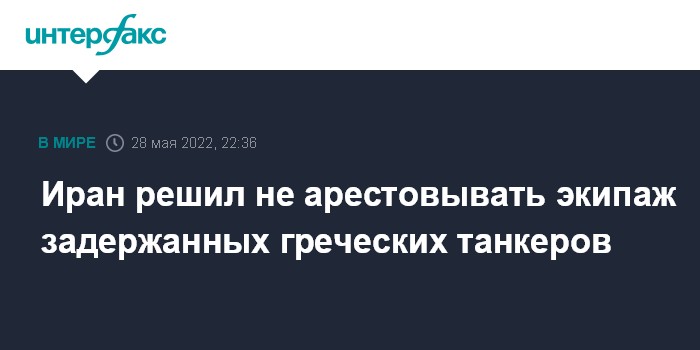 Москва. 28 мая. INTERFAX.RU - Власти Ирана заявили в субботу, что члены экипажа двух задержанных ранее греческих танкеров не находятся под арестом, сообщают западные СМИ.