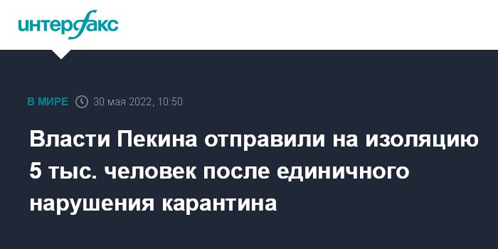 Москва. 30 мая. INTERFAX.RU - В Пекине из-за мужчины, нарушившего изоляцию в связи с COVID-19, на карантин отправились 5 тысяч человек, сообщает в понедельник The Guardian.