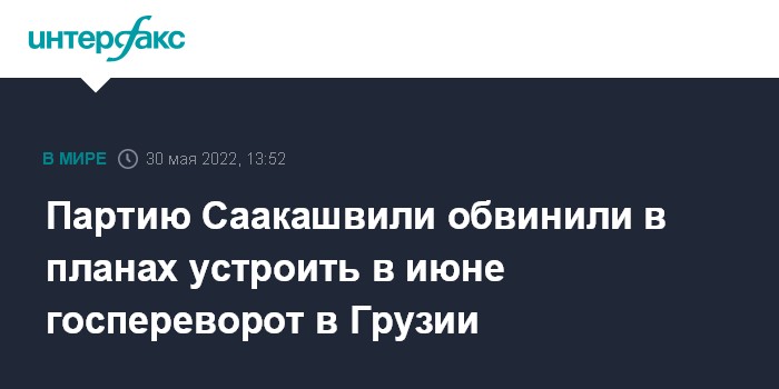 Москва. 30 мая. INTERFAX.RU - Председатель правящей партии "Грузинская мечта" Ираклий Кобахидзе обвинил оппозиционную партию "Единое национальное движение" (основана бывшим президентом Грузии Михаилом Саакашвили - ИФ) в намерениях в конце июня осуществить в Грузии государственный переворот.
