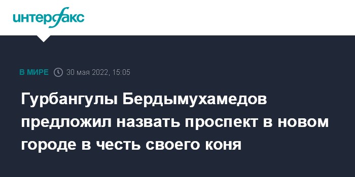 Москва. 30 мая. INTERFAX.RU - Бывший президент Туркменистана, председатель верхней палаты парламента страны Гурбангулы Бердымухамедов предложил назвать один из проспектов строящегося нового города в честь своего любимого коня Акхана (Белый хан), сообщила правительственная газета "Нейтральный Туркменистан".