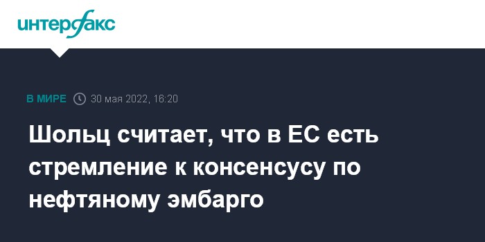 Москва. 30 мая. INTERFAX.RU - Канцлер Германии Олаф Шольц считает, что в Евросоюзе есть стремление добиться консенсуса по вопросу эмбарго на российскую нефть.