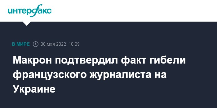 Москва. 30 мая. INTERFAX.RU - Французский журналист Фредерик Леклер-Имхофф, работавший на Украине, получил смертельное ранение, сообщил в понедельник президент Франции Эммануэль Макрон.