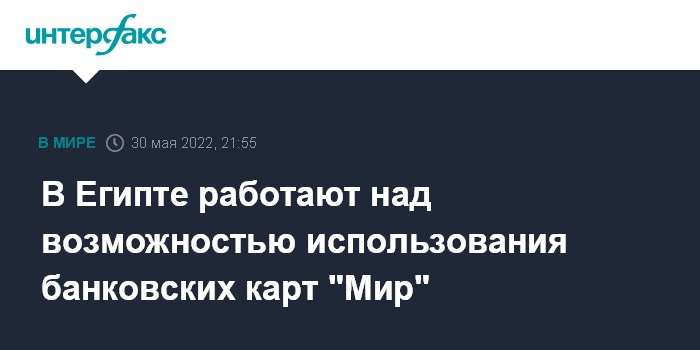 Москва. 30 мая. INTERFAX.RU - Правительство Египта прорабатывает с банками возможность использования в стране карт российской платежной системы "Мир", этот вопрос может быть решен к сентябрю. Об этом сообщил журналистам в понедельник заместитель генерального директора TEZ TOUR Египет Тамер Саид.