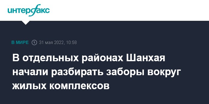 Москва. 31 мая. INTERFAX.RU - В Шанхае начале разбирать заборы, окружавшие жилые комплексы на протяжении двух месяцев локдауна, с 1 июня в городе возобновится работа транспорта, людям разрешат ездить на работу и отменят пропуска, по которым горожане могли выйти на улицу на несколько часов, пишет Guardian.