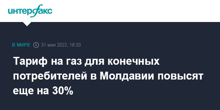 Москва. 31 мая. INTERFAX.RU - Тариф на газ для конечных потребителей в Молдавии повысится с 1 июня еще на 30%, соответствующее решение приняло во вторник Национальное агентство по регулированию в энергетике (ANRE) республики.