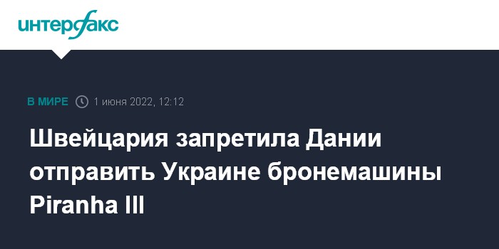 Москва. 1 июня. INTERFAX.RU - Власти Швейцарии не дали разрешение Дании передать Украине 20 бронемашин швейцарского производства Piranha III. Об этом сообщила в среду телерадиовещательная компания SRF со ссылкой на источники.