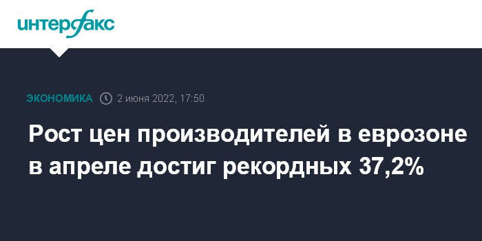 Москва. 2 июня. INTERFAX.RU - Цены производителей (индекс PPI) в еврозоне в апреле взлетели на 37,2% по сравнению с тем же месяцем годом ранее. Об этом свидетельствуют данные Статистического управления Европейского союза (Eurostat).