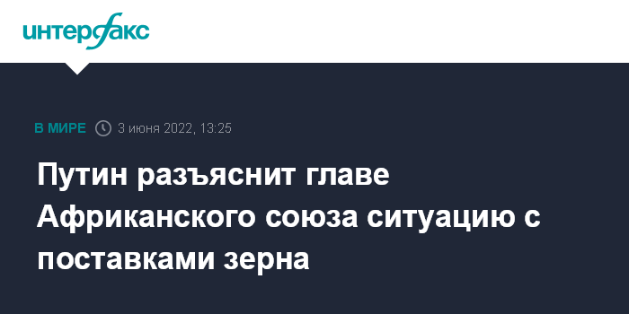 Отвечая на вопрос журналистов, будет ли тема поставок украинского и российского зерна на рынки затронута в ходе встречи с лидером Африканского союза, пресс-секретарь президента РФ Дмитрий Песков сказал: "С высокой долей вероятности могу предположить, что президент даст исчерпывающие объяснения своего видения ситуации с украинским зерном. Он расскажет нашим африканским гостям и друзьям ситуацию де-факто, реальное положение дел".