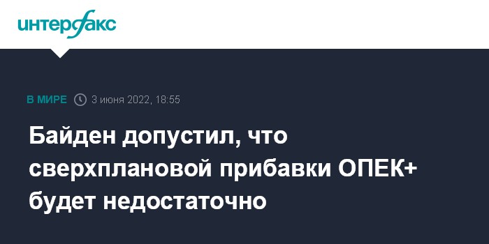 Москва. 3 июня. INTERFAX.RU - Президент США Джо Байден в пятницу положительно оценил решение ОПЕК+ увеличить квоту на добычу нефти, однако он не уверен, что эта мера будет достаточной в нынешних рыночных условиях.