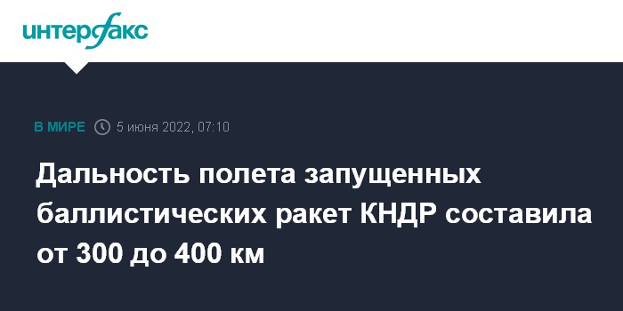 Москва. 5 июня. INTERFAX.RU - Запущенные в воскресенье Северной Кореей баллистические ракеты малой дальности преодолели расстояние от 300 до 400 км, сообщило агентство Kyodo со ссылкой на министра обороны Японии Нобуо Киси.