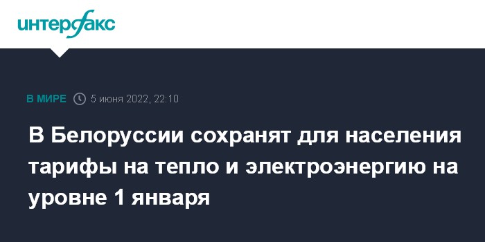 Москва. 5 июня. INTERFAX.RU - Правительство Белоруссии утвердило сохранение тарифов для населения на теплоснабжение и электроэнергию на уровне 1 января 2022 года, сообщили в пресс-службе правительства.