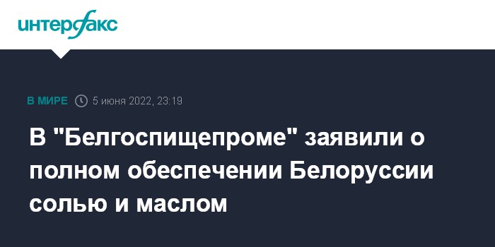 Москва. 5 июня. INTERFAX.RU - Глава "Белгоспищепрома" Олег Жидков в интервью телеканалу СТВ заверил белорусов в отсутствии какого-либо дефицита на соль и растительное масло, которые для собственных нужд в стране производятся в полном объеме, а также востребованы за пределами Белоруссии.
