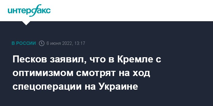 Москва. 6 июня. INTERFAX.RU - В Кремле с оптимизмом смотрят на ход специальной военной операции РФ на Украине, заявил журналистам пресс-секретарь президента РФ Дмитрий Песков.