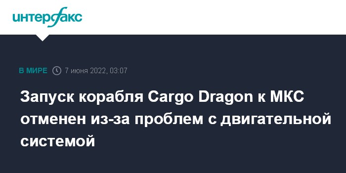 Москва. 7 июня. INTERFAX.RU - Запуск грузового космического корабля компании SpaceX Cargo Dragon к Международной космической станции (МКС) отменен из-за проблем с двигателями малой тяги, сообщило Национальное управление США по аэронавтике и исследованию космического пространства (NASA).