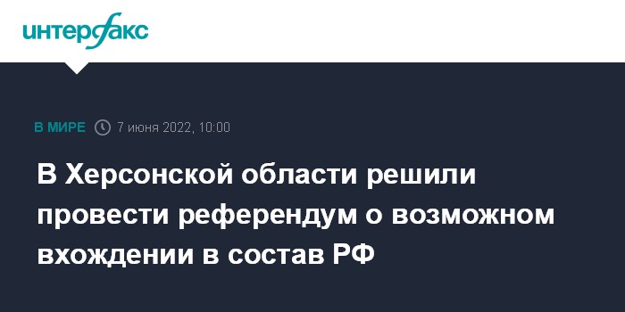 Москва. 7 июня. INTERFAX.RU - Референдум будет проведен в Херсонской области Украины для решения вопроса о возможном присоединении к России, сообщил заместитель главы военно-гражданской администрации (ВГА) региона Кирилл Стремоусов.