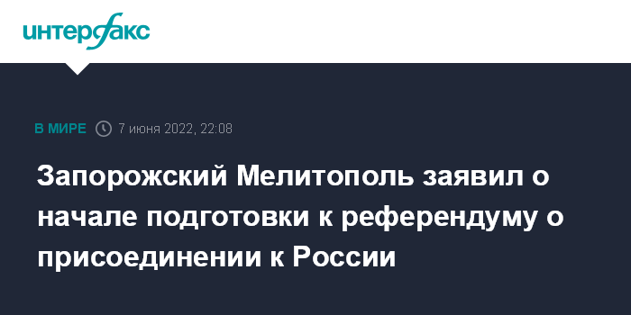 Москва. 7 июня. INTERFAX.RU - Подготовка к референдуму началась в подконтрольном РФ Мелитополе Запорожской области, сообщила во вторник глава военно-гражданской администрации города Галина Данильченко.