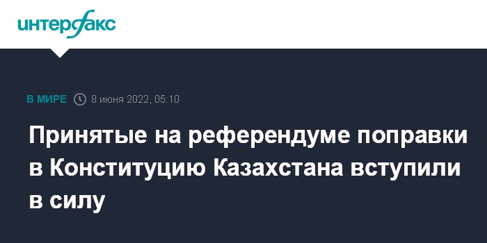 "Закон Республики Казахстан "О внесении изменений и дополнений в Конституцию Республики Казахстан", вынесенный на республиканский референдум 5 июня 2022 года, считается принятым, так как за положительное решение проголосовало более половины граждан, принявших участие в голосовании, не менее чем в двух третях областей, городов республиканского значения и столицы", - говорится в официальном сообщении ЦИК.