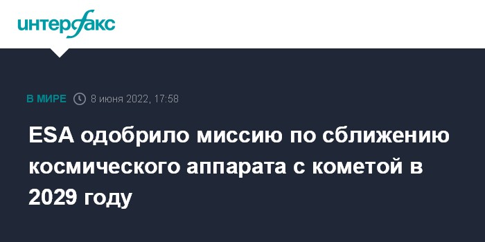 Москва. 8 июня. INTERFAX.RU - Европейское космическое агентство (ESA) одобрило проведение миссии Comet Interceptor по сближению космического аппарата с кометой для изучения ее структуры и состава, старт миссии запланирован на 2029 год, сообщается на сайте агентства в среду.