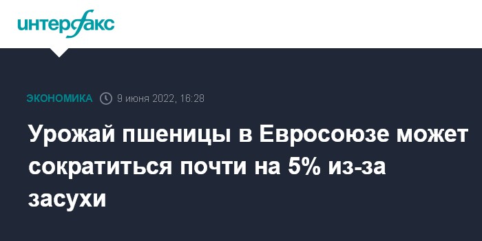Москва. 9 июня. INTERFAX.RU - В наступающем сельскохозяйственном 2022-2023 году урожай пшеницы в Евросоюзе может сократиться почти на 5% в годовом выражении из-за засушливой погоды и это усугубит ситуацию на рынке на фоне резкого сокращения поставок с Украины, полагают аналитики исследовательской компании Strategie Grains.