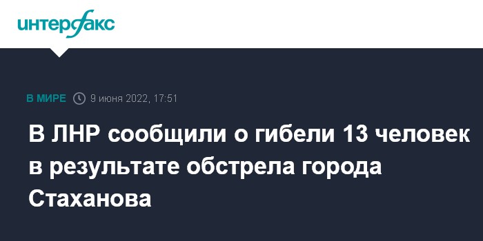 Москва. 9 июня. INTERFAX.RU - Глава Луганской Народной Республики Леонид Пасечник сообщил, что число погибших и пострадавших в результате обстрела Стаханова со стороны украинской армии в четверг составляет 13 человек.