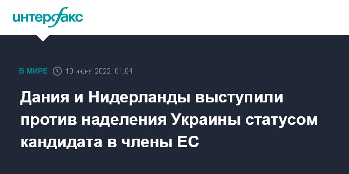 Москва. 10 июня. INTERFAX.RU - Дания и Нидерланды выступают против предоставления Украине статуса кандидата на вступление в ЕС, а Германия предлагает дать стране некий условный статус кандидата, пишет Bloomberg со ссылкой на источники.