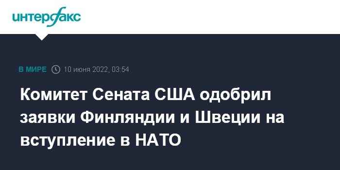 Москва. 10 июня. INTERFAX.RU - Комитет Сената США по международным отношениям в четверг единогласно принял резолюцию, призывающую НАТО быстро принять Финляндию и Швецию в альянс.