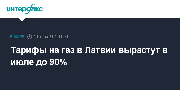 Москва. 10 июня. INTERFAX.RU - Тарифы на природный газ для домашних хозяйств в Латвии с 1 июля 2022 года в зависимости от объема потребления вырастут в пределах от 65,6% до 89,9%, сообщает в пятницу агентство BNS со ссылкой на латвийскую газовую компанию Latvijas gaze.