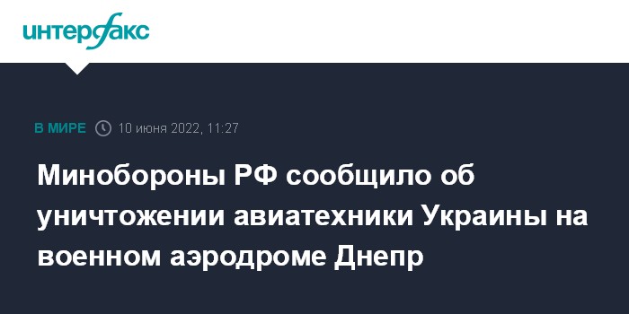 Москва. 10 июня. INTERFAX.RU - Российская авиация высокоточными ракетами уничтожила авиатехнику Украины на военном аэродроме Днепр, сообщил официальный представитель Минобороны РФ Игорь Конашенков.